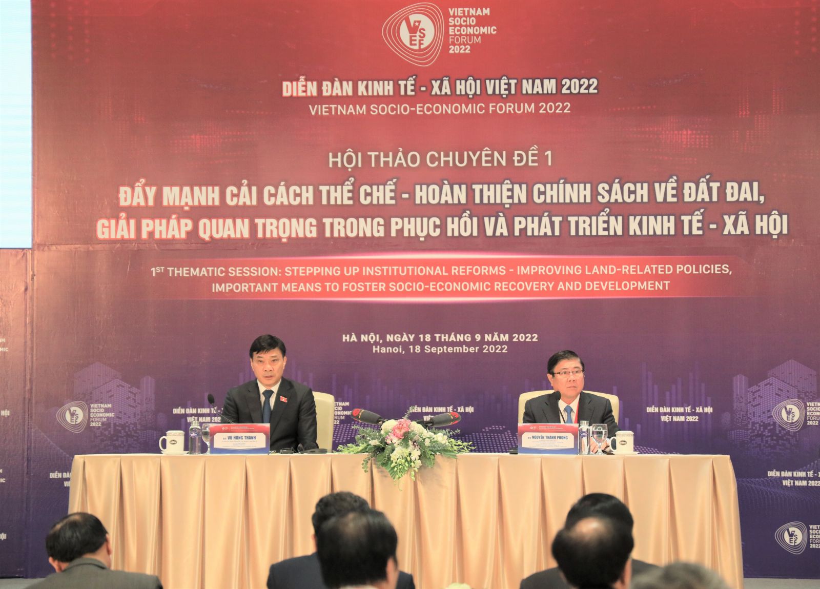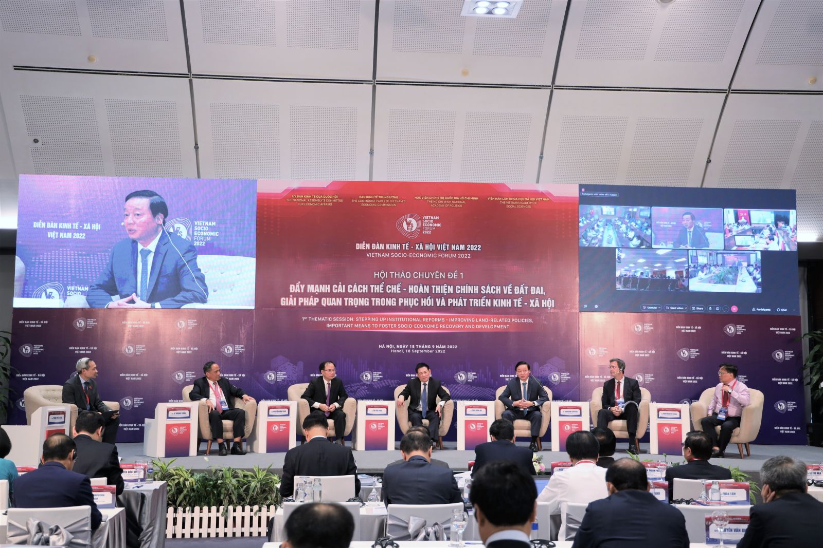 Ngay sau khai mạc Diễn đàn, dưới sự điều hành của Chủ nhiệm Ủy ban Kinh tế Vũ Hồng Thanh và Phó Trưởng ban Kinh tế Trung ương Nguyễn Thành Phong đã diễn ra Hội thảo chuyên đề 1 với nội dung: “Đẩy mạnh cải cách thể chế - Hoàn thiện chính sách về đất đai, giải pháp quan trọng trong phục hồi và phát triển kinh tế - xã hội”.