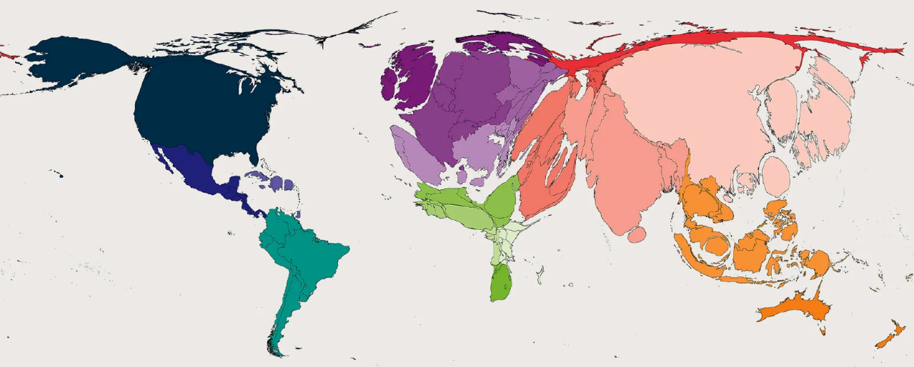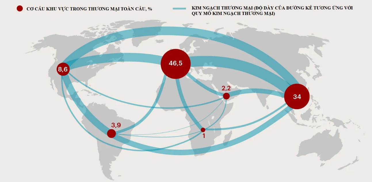 Chính vì vậy, không có gì ngạc nhiên khi ba nền kinh tế lớn nhất thế giới - Mỹ, Trung Quốc và Liên minh Châu Âu - đang có hoạt động thương mại nhiều nhất với nhau, còn đối với các quốc gia còn lại, ba nền kinh tế này (hoặc một trong số đó) đang đóng vai trò đối tác thương mại chính (hoặc tối thiểu là một trong số). Về khía cạnh địa lý, ba nền kinh tế này nằm tương đối gần với các quốc gia khác. Điều đó giúp xác định được cả sức mạnh kinh tế, lẫn tầm ảnh hưởng chính trị của các quốc gia này (xem Hình 1).