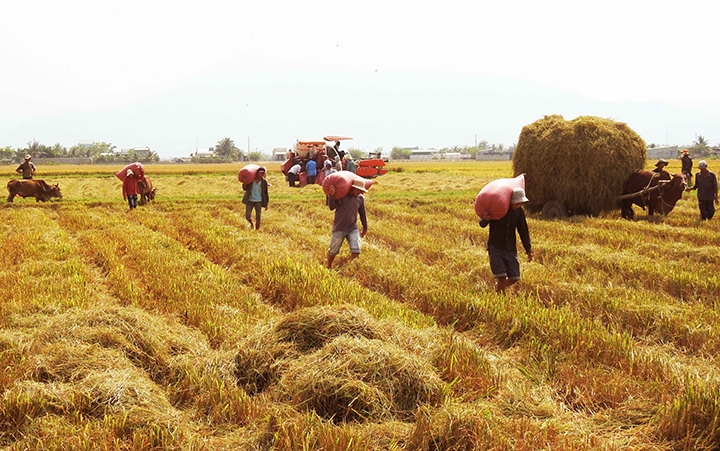 Ngay từ sáng sớm, hàng trăm nông dân người Chăm mang theo bao đựng lúa và các vật dụng khác tề tựu ngay chân ruộng hòa trong niềm vui mùa vụ bội thu tại cánh đồng lớn Phước Hậu. Trong khuôn viên sân phơi nông sản của HTX dịch vụ nông nghiệp Phước Hậu, nhiều xe máy gặt đập liên hợp, xe máy cày kéo theo rơ-moóc đã tập kết và đợi lệnh xuống đồng. Nông dân không phải lội xuống ruộng để cắt lúa, bà con thong thả đứng trên bờ theo dõi những chiếc máy gặt đập lần lượt băng qua từng rãnh lúa thẳng, dài tăm tắp trên ruộng. Sau vài đường chạy, máy gặt đập "tấp" vào bờ, lúa đã được đóng bao, lượng lúa bị rơi vãi không đáng kể. Nông dân cân lúa ngay tại chân ruộng và dễ dàng chất lúa lên các xe máy cày đợi sẵn trên bờ chở về sân phơi tập thể do HTX bố trí gần đó. Việc thu hoạch 56 ha lúa chỉ trong buổi sáng.